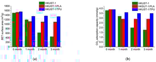 Variation of (a) BET surface area and (b) CO2 adsorption capacity of pristine HKUST−1, HKUST−1/PLA and HKUST−1/TPU extrudates stored in humid conditions for 3 months.