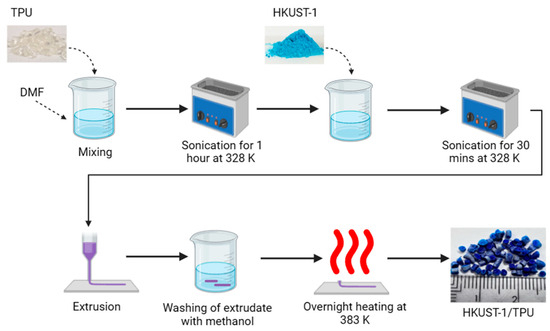 The shaping extrusion process applied to produce HKUST−1/TPU was the same as the one employed to produce the HKUST−1/PLA composite and is described in detail in [46]. Briefly, 0.1 g of TPU was dissolved inside 1 mL of solvent (DMF) using an ultrasonic bath at 328 K for the duration of 1 h. Once TPU was dissolved, 0.9 g of pristine HKUST−1 powder was gradually added to the solution, and further sonification was performed for 30 min to obtain a homogenous mixture that contained 10 wt% binder content. The HKUST−1/TPU suspension was then inserted into a 5 mL DB syringe, followed by its extrusion. Next, the extruded HKUST−1/TPU was briefly washed with methanol to promote an exchange with DMF. Methanol, in having a lower boiling point than DMF, promoted a thorough drying of the HKUST−1/TPU composite. The drying step was performed overnight at 383 K and under vacuum to remove the leftover solvent molecules (DMF or methanol). The dried HKUST−1/TPU composite was then cut using scissors into small cylinders of about 1–2 mm in length. Figure 17 illustrates the synthesis process of HKUST−1/TPU.