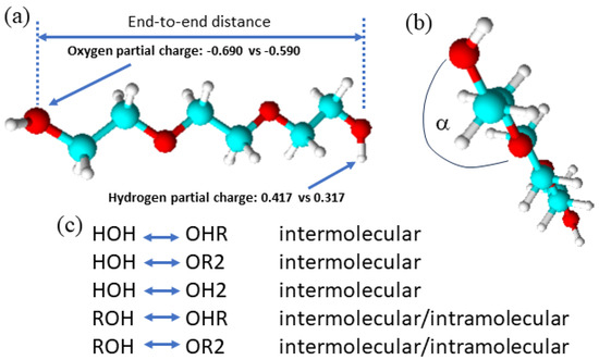 (a) Triethylene glycol as an example of ethylene glycol oligomers that make up PEG200, H-[O-CH2-CH2]n-OH, shown with the distance between the oxygen atoms of the terminal hydroxy end groups used in this report as a measure for the end-to-end distance, and the changes in the hydroxy partial charges in the modified OPLS forcefield; (b) an illustration of the proper dihedral angle referred to as (HO)-C-C-O in this report for which its potential energy was reduced in the modified OPLS forcefield; (c) a summary of possible inter- and intramolecular hydrogen bonding interactions in the studied water containing ethylene glycol oligomer mixtures.