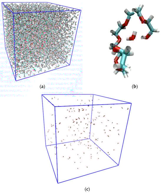 The simulations with hexaethylene glycol consisted of 500 molecules total, while all other systems consisted of 1000 molecules total. The molecules were placed randomly with the GROMACS module “insert-molecules” into a cubic box with an initial density approximately 20% lower than the experimental density [14]. Given that the water mass fraction was kept constant for all simulations, the number of water molecules varied from system to system depending on the molar mass of the oligomer. Keeping the mass fractions rather than the mole fractions the same ensures approximately the same amount of ether functionalities present across simulated oligomer systems for a fairer comparison. The exact number composition of each system is, for clarity, summarized in Table S1 in the Supplementary Materials section. The prepared systems were energy minimized using the steepest descent algorithm [32] where an initial maximum atom displacement of 0.01 nm was used to remove high energy contacts that might have been accidentally generated during system preparation. The “DEFLEXIBLE” option was chosen to allow the water to be treated as flexible rather than rigid molecules during this simulation step. Periodic boundary conditions were applied via the Verlet cutoff scheme [33] using a buffer tolerance of 0.005 kJ mol−1 ps−1. The cut-off distance for nonbonding electrostatics and LJ interactions were set at 1.4 nm and the long-range electrostatic interactions were accounted for using the Smooth Particle-Mesh Ewald (PME) scheme [34,35] with a grid spacing of 0.168 nm.