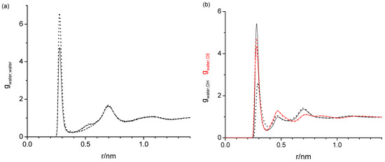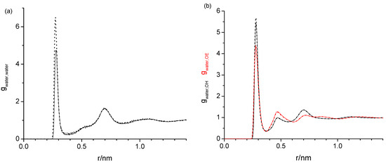 The task remaining for this subsection is to provide a molecular level interpretation of the RDFs. Clearly, water is hydrogen bonding to other water molecules as well as to the hydroxy and ether functionalities of the oligomers as schematically summarized in Figure 1. The O-O atom-to-atom distance is approximately the same in each case, which is reflected by the first peak at 0.280–0.285 nm present in all RDFs in Figure 3, Figure 4, Figure 5 and Figure 6. The height of this first peak is similarly high in all shown RDFs except for the water–diethylene glycol ether RDF in Figure 3b, where this peak is very small. This can readily be explained by the presence of just one ether functionality in the diethylene glycol. As shown in Figure 2b, the oligomers may configure themselves to allow for the maximum closeness of their ether and hydroxyl oxygen atoms to water. In this particular snapshot of Figure 2b, the water oxygen atom is separated by slightly less than 0.3 nm to one hydroxyl atom and three ether oxygen atoms, which is consistent with the first peak position in the RDFs. The distance to the remaining two ether atoms of the hexaethylene glycol in Figure 2b is between 0.4 and 0.5 nm, which is consistent with the position of the second peak in the water-OE RDFs in Figure 3, Figure 4, Figure 5 and Figure 6. Likewise, when the water molecule is hydrogen bonded to an ether oxygen, the distance of the oligomer hydroxy group may also be 0.4 nm–0.5 nm away from the water oxygen atom, hence the similar second peak in the water-OH RDFs in Figure 3, Figure 4, Figure 5 and Figure 6. There is an additional contribution to this second peak in the water-OH RDF that arises from the scenario when the oligomer hydroxyl group is engaged in hydrogen bonding not only to water but also another oligomer hydroxyl group. It is also possible that two water molecules hydrogen bond to the same hydroxyl group, although this was only occasionally observed when expecting the simulation trajectory. Nevertheless, the scenario of the two water molecules forming hydrogen bonds to the same hydroxy group may explain the small peak in the water–water RDFs in Figure 3a and Figure 4a near 0.5 nm. This peak is absent in Figure 4a for the RDF obtained with the modified OPLS force field. This can be explained by the prior observation that the modifications to the OPLS forcefield result in an overall reduction in hydrogen bonding and a shift from inter- towards intramolecular hydrogen bonding [16]. A third peak near 0.7 nm is observed in all of the three RDFs, water–water, water-OH, and water-OE (except for diethylene glycol in Figure 3b) in Figure 3, Figure 4, Figure 5 and Figure 6. This peak arises from the scenario when the two sites of the oligomer are engaged in hydrogen bonding but such that their interaction are on opposite sides (anti) of each other. In the case of the water–water RDFs, these are two water molecules interacting in such a way with the oligomer. The additional maxima in the water–water RDFs in Figure 3, Figure 4, Figure 5 and Figure 6 are spaced in equal distance increments, which corresponds to how far the two ethylene glycol oxygen moieties to which the water hydrogen bonds are separated, i.e., by how many ethylene oxide units the two moieties are separated.