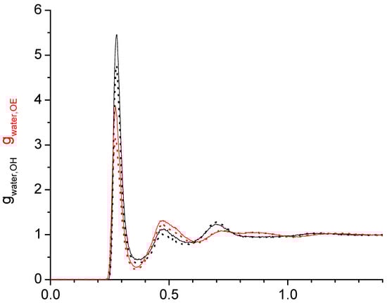 Radial distribution functions of the water oxygen–oligomer hydroxy oxygen (black) and water oxygen–oligomer ether oxygen (red) for 0.02 mass fraction of water in the tetraethylene glycol (solid line) and in the PEG200 (dotted line) obtained with the water force fields SPC/E in combination with the OPLS forcefield.