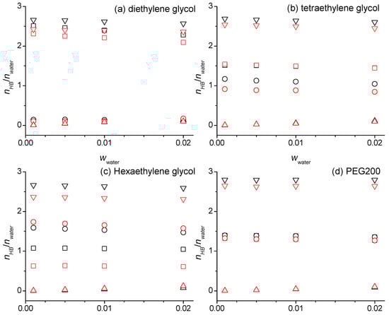 Number of the hydrogen bonds per number of the water molecules for the intermolecular hydrogen bonding of the water with hydroxy groups (squares), ether groups (circles), other water molecules (triangle up), and the total of all these water hydrogen bonding interactions (triangle down) as a function of the water mass fractions, wwater, at 328 K for diethylene glycol (a), tetraethylene glycol (b), hexaethylene glycol (c), and PEG200 (d) obtained from the simulations using the SPC/E force field for the water and the OPLS (black symbols) or the modified OPLS force field (red symbols) for the oligomers.