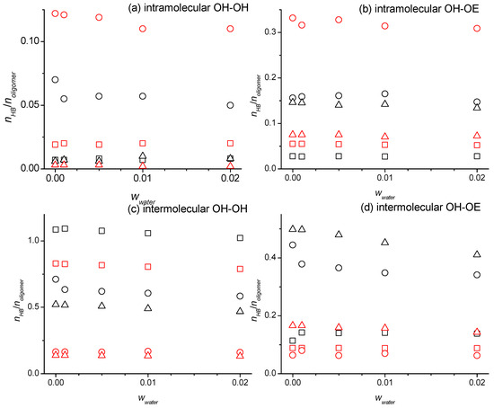Number of hydrogen bonds per number of the oligomer molecules for intramolecular hydrogen bonding between (a) the two hydroxy groups and (b) the hydroxy and ether groups and for intermolecular hydrogen bonding between (c) the two hydroxy groups and (d) hydroxy and ether groups as a function of the water mass fractions, wwater, at 328 K for the diethylene glycol (squares), tetraethylene glycol (circles), and hexaethylene glycol (triangle up), obtained from the simulations using the SPC/E force field for water and the OPLS (black symbols) or the modified OPLS force field (red symbols) for the oligomers.