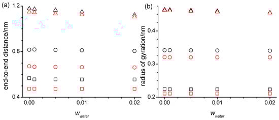 (a) End-to-end distances and (b) the radii of gyration as a function of the water mass fractions, wwater, at 328 K for the diethylene glycol (squares), tetraethylene glycol (circles), and hexaethylene glycol, (triangle up), obtained from the simulations using the SPC/E force field for water and the OPLS (black symbols) or the modified OPLS force field (red symbols) for the oligomers.
