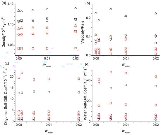 (a) Densities, (b) viscosities, and self-diffusion coefficients of the (c) oligomers and (d) water as a function of the water mass fractions, wwater, at 328 K for the diethylene glycol (squares), tetraethylene glycol (circles), hexaethylene glycol (triangle up), and PEG 200 (triangle down) obtained from the simulations using the SPC/E force field for water and the OPLS (black symbols) or the modified OPLS force field (red symbols) for the oligomers.