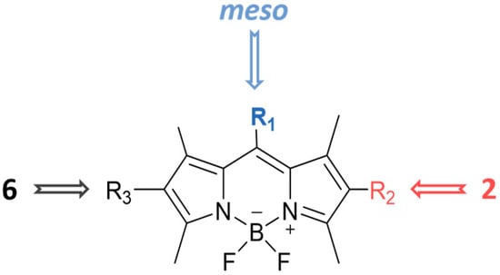 Functionalization of the BODIPY core at meso position, 2 position and 6 position with different substituents groups.