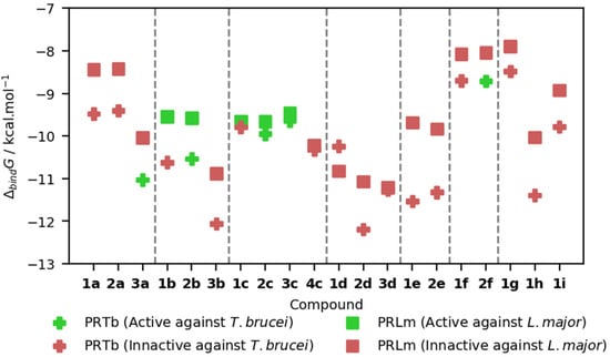 In order to rationalize the antileishmanial and antitrypanosomal activity data presented in Table 2 for the 20 BODIPY derivatives, their interaction with pteridine reductase native to L. major (PRLm) and T. brucei (PRTb) was studied using a molecular docking protocol.