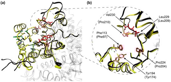 Aligned structures of PRLm (black) and PRTb (yellow) in ribbons representation. Amino acid residues targeted for antileishmanial activity (positive loading value in Table 3) are shown in the structure of PRLm in green, and their homologues in PRTb are highlighted in light blue. Amino acid residues associated with a lack of antileishmanial activity (negative loading value in Table 3) are highlighted in red (PRLm), whereas their homologues in PRTb are depicted in pink. (a) The overall structure of chain A (chains B, C and D of both enzymes are depicted using high transparency). (b) Detailed view of the pocket surrounding Val230 in PRLm, with the structural homologues in PRTb labeled inside parenthesis.
