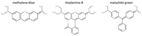 The present study was carried out using three model dyes (Figure 6): methylene blue (Sigma Aldrich, Saint Louis, MO, USA), rhodamine B (Sigma Aldrich, Saint Louis, MO, USA), and malachite green (Sigma Aldrich, Saint Louis, MO, USA). Aqueous solutions were prepared by dissolving the appropriate amount of each dye in ultra-pure water to obtain a concentration of 10 mg/L of organic C.