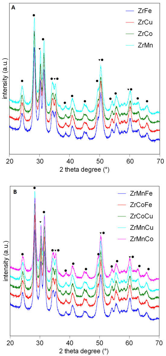 The surface area of bare ZrO2 is 64 m2/g. The addition of a single metal does not significantly affect the surface area (53–56 vs. 64 m2/g). Even for bimetallic systems, the influence on the surface area is minimal, with a larger decrease found for systems based on Co, i.e., ZrCoCu and ZrCoFe, for which a value of 46 m2/g is observed. Figure 2 shows the diffraction profiles of monometallic and bimetallic catalysts supported on zirconia.