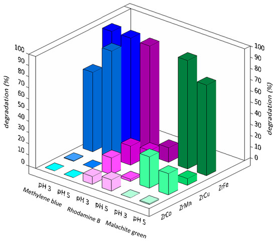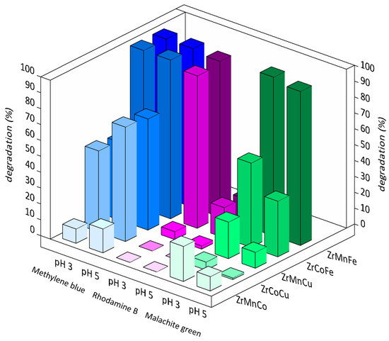 In summary, methylene blue is confirmed as the easiest molecule to degrade: not only did all the catalysts prove to be active but their activity was quite high, with the sole exception of ZrMnCo. As observed for the ZrCu formulation, the degradation of the target molecule is easier at pH 5 compared to pH 3. Rhodamine B, on the other hand, is confirmed as the most difficult compound to degrade. Excellent results are obtained with ZrMnFe and ZrCoFe at pH 3; however, all the other experiments, except for two mediocre results well below the 20% threshold (ZrMnFe and ZrCoFe, at pH 5), show a significant ineffectiveness, regardless of the catalyst used. The catalytic activity on malachite green gave intermediate results between those obtained on the other two model solutions. The trend for monometallic systems is also confirmed: the increase in pH induces a reduction in efficiency.