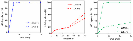 Degradation at different time intervals for the three model solutions (methylene blue (MB), rhodamine B (RB), malachite green (MG)) with ZrMnFe and ZrCoFe at pH 5.