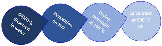 Two series of metal catalysts, monometallic and bimetallic, were prepared on a zirconia (ZrO2) support. In the first series, the monometallic catalysts, the zirconia support was modified by the addition of 2.5 wt% of a transition metal (Co, Cu, Fe or Mn), while the bimetallic catalyst series was obtained by impregnation of two metals (Co/Cu, Co/Fe, Co/Mn, Cu/Mn and Fe/Mn) at 2.5 wt% each. The ZrO2 support was prepared by calcination of zirconium hydroxide at 500 °C for 3 h (Mel Chemicals, Manchester, UK). The metal precursors (cobalt(II) nitrate hexahydrate Co(NO3)2•6H2O, copper (II) nitrate hemi (pentahydrate) Cu(NO3)2•2,5H2O, iron (III) nitrate nanohydrate Fe(NO3)3•9H2O, manganese (II) nitrate hydrate Mn(NO3)2•H2O; Sigma Aldrich, Saint Louis, MO, USA) were dissolved in a volume of water previously determined by evaluating the wetting point of the zirconia; this aqueous solution was then added to the support for incipient wetness impregnation (IWI). Bimetallic materials were obtained by simultaneous impregnation of two metals. After impregnation, the samples were dried at 100 °C overnight and then calcined in a muffle at 500 °C for 3 h to remove the nitrates, leaving the metal species bonded to the support. The procedure is summarized in Scheme 1.