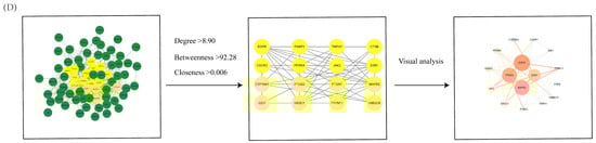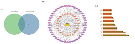 After 32 candidate bioactive ingredients were eliminated, 168 potential targets were obtained from the drug database for further analysis. The 2447 wound-healing-related targets in the database were then compared with the aforementioned 704 potential targets for compounds in BEO, and 71 overlapping targets were found (Figure 2A). The results showed that the BEO has the potential to promote wound healing. A component–target network was constructed based on 71 assumed targets for BEO wound-healing treatment, as shown in Figure 2B.