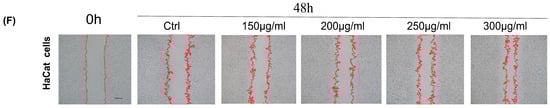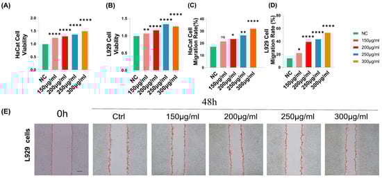 During wound healing, neighboring stromal cells are required to migrate to the wound site and then proliferate. The effect of proliferation was studied by the CCK8 activity assay. The results showed that BEO had a positive concentration correlation for promoting the proliferation of HaCaT cells when the concentration was 100–300 μg/mL. The proliferation of HaCaT cells reached a maximum of 149% when the BEO concentration was 300 μg/mL, and the proliferation of L929 cells reached a maximum of 134% when the BEO concentration was 250 μg/ mL (Figure 3A,B). In vitro scratch wound assays on HaCaT and L929 monolayers were used to evaluate the effect of the extracts on skin cell migration. The results showed that BEO levels at 150, 200, 250 and 300 μg/mL could promote the migration of HaCaT cells and L929 cells (Figure 3C–F).