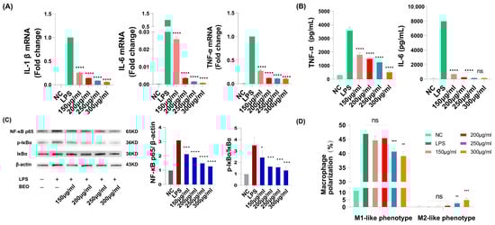 BEO attenuated the inflammatory response in RAW 264.7 cells stimulated by LPS. (A) qPCR of IL-1β, IL-6 and TNF-α levels in RAW 264.7 cells that were stimulated by LPS at 24 h from different groups. (B) The level of IL-6 and TNF-α secreted by RAW 264.7 cells treated with BEO was determined by ELISA. (C) Effects of 150 μg/mL, 200 μg/mL, 250 μg/mL and 300 μg/mL BEO on the expression of NF-κB/p-IκBα protein. (D) The cell typing of RAW 264.7 was detected by flow cytometry. Polarization rate (D) and sectional images (E,F) of each group are shown. n = 3. *, p < 0.05; **, p < 0.01; ***, p < 0.001; **** p < 0.0001; ns, not significant.