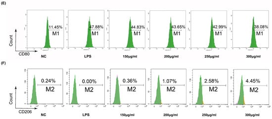 Macrophage polarization is involved in many signaling pathways, such as the NF-κB, JAK2/STAT3, ROS/ERK and mTOR signaling pathways []. Western blot analysis was performed to detect the expression of related proteins in RAW 264.7 cells treated with LPS. The results demonstrated that the essential oil significantly reduced the levels of NF-κB p65 and p-IκBα in a dose-dependent manner after LPS activation (Figure 4C). Flow cytometry was utilized to analyze the effects of different concentrations of BEO on the polarization of macrophages into M1 and M2 phenotypes. The findings indicated that at concentrations of 150 and 200 μg/mL, there was no significant difference observed in the inhibition of M1 polarization or the promotion of M2 polarization in macrophages (Figure 4E,F). However, at concentrations of 250 and 300 μg/mL, BEO exhibited inhibitory effects on M1 polarization and promoted M2 polarization in macrophages. In comparison to the LPS-stimulated group, BEO concentrations of 250 and 300 μg/mL reduced the polarization of M1 macrophages by 4.89% and 9.8%, respectively, while increasing the polarization of M2 macrophages by 2.3% and 4.5%, respectively (Figure 4D).