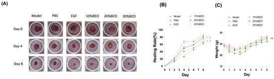 The effect was proved in vitro, but its mechanism of action in vivo remained unclear. To investigate this further, experiments were conducted on skin-cut mice. Medication was administered on the third day after molding to assess the effect of BEO on incision wounds in vivo. Different concentrations of BEO were applied to surgical wounds in mice and compared with the control group (wound without any treatment), positive control group (EGF) and negative control group (PBS). The effect was verified by the change in wound area (Figure 5A). Compared to the healing rate of the control group (62.39%), the wound-healing rates of 10%BEO (74.37%), 20%BEO (79.51%) and 30%BEO (81.72%) were all higher.