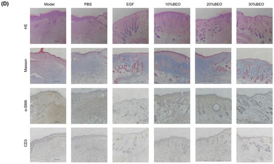 The HE staining results showed that the skin structure of the EGF group and 30%BEO group was more complete, the epidermal layer was thinner, keratinization was improved, and hair follicles and glands were formed compared with the model group (Figure 5D). The collagen fibers (blue) in the EGF group and 30%BEO group were more abundant and more orderly than those in other groups, as determined by Masson staining (Figure 5D). The α-SMA immunohistochemistry results showed that the expression of α-SMA (brown) was significantly up-regulated in the model group and the negative control group compared with the EGF group and the BEO group at different concentrations, as shown in Figure 5D. BEO reduces the infiltration of CD3+ T cells in the local microenvironment at the wound site, which is consistent with the wound-healing process (Figure 5D).