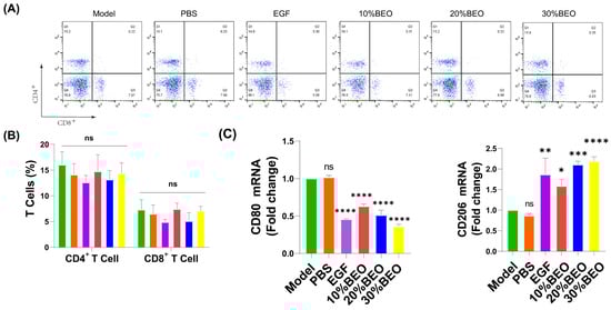 The mRNA levels of inflammatory factors TNF-α, IL-1β and IL-6 in the local wound microenvironment were detected, and TNF-α and IL-1β were significantly decreased, especially in the 30%BEO group (Figure 6D). In addition, compared with the model group, the expression of CD80 in the BEO-treated group was reduced, while CD206 was increased (Figure 6C), which was consistent with the trend of the wound-healing rate. Above all, BEO played a role in resisting external infection, reducing inflammation levels and promoting wound healing. Flow staining typing of lymphocytes isolated from the spleen of mice showed that there was no significant difference in the positive rates of CD4+ T cells and CD8+ T cells among all groups (Figure 6A,B), indicating that the local application of BEO had no significant toxicity.
