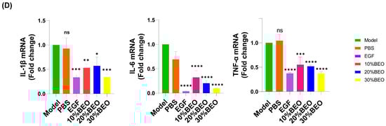 Excessive inflammation can disrupt tissue homeostasis and hinder wound healing. Macrophages and secreted cytokines play an important role in the wound-healing process. To simulate the excessive inflammation caused by macrophages cell line, RAW 264.7 cells were treated with LPS, and the expression of inflammatory factors including IL-1β, IL-6 and TNF-α was detected by q-PCR. The results showed that the mRNA expression levels of IL-1β, IL-6 and TNF-α were significantly increased after oil incubation (Figure 4A). BEO had a more significant effect on reducing the secretion of inflammatory cytokines in macrophages than the positive drug epidermal growth factor (EGF). In addition, the secretion of IL-6 and TNF-α was significantly decreased in a dose-dependent manner (Figure 4B).