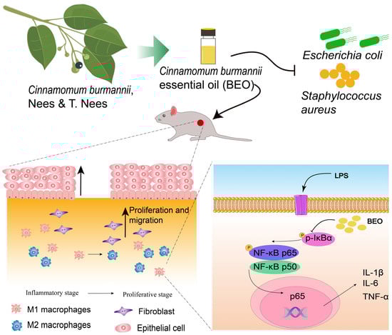 Our network pharmacology results suggested that BEO may promote wound healing by stimulating cell proliferation and migration, as well as modulating inflammatory and immune responses. We subsequently performed experiments to test this hypothesis in vitro and in vivo. Besides promoting skin stromal cell proliferation and migration, BEO significantly reduced the mRNA expression levels of IL-1β, IL-6, and TNF-α through the NF-κB pathway in RAW 264.7 cells. Additionally, the flow results showed that BEO could inhibit macrophage M1 polarization and promote M2 polarization. In animal experiments, the effect of BEO on wound healing in mice was studied. BEO with a 30% concentration had the best healing effect. Histological analysis of skin tissues revealed that the skin structure was more complete and collagen fibers were more regularly arranged in the treated group than in the model group. Additionally, the expression levels of inflammatory factors TNF-α, IL-1β and IL-6 in the local wound microenvironment of the treatment group were reduced, which was consistent with the wound-healing process. Excessive inflammatory factors during wound healing could lead to scar formation and slow wound healing in later stages [], and the results suggested BEO may also reduce scar formation during wound healing. The possible mechanism by which BEO promotes wound healing is shown in Figure 7.