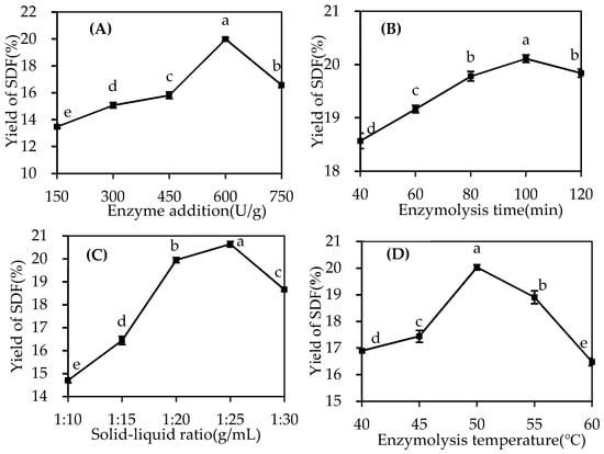 Effects of enzyme addition (A), enzymolysis time (B), solid–liquid ratio (C) and enzymolysis temperature (D) on SDF yield. Different letters in the same figure indicate significant differences (p < 0.05).