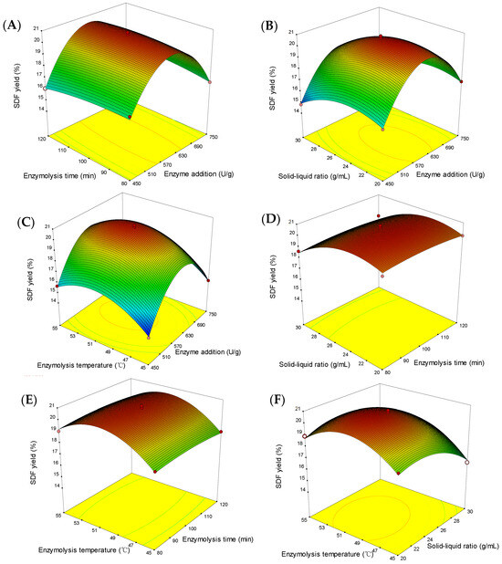 Response surface diagram. The interaction of enzyme addition and enzymolysis time (A), enzyme addition and solid–liquid ratio (B), enzyme addition and enzymolysis temperature (C), enzymolysis time and solid–liquid ratio (D), enzymolysis time and enzymolysis temperature (E) and solid–liquid ratio and enzymolysis temperature (F) and effects on SDF yield.