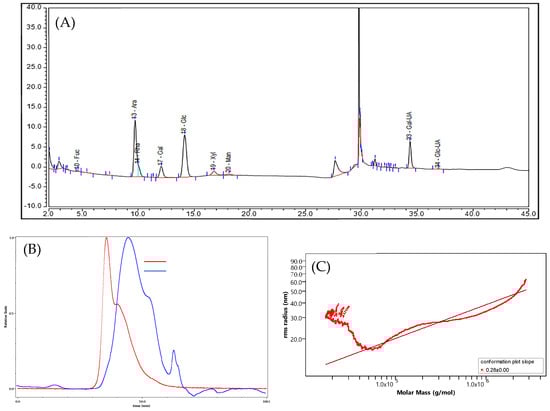 The elution curves of AP-SDF under multi-angle laser light scattering (LS) detector and refractive index (RI) detector are shown in Figure 3B. A large broad peak was detected by both LS and RI, with two small peaks under the detection of RI, while LS has a small peak. This was due to the fact that low concentrations of polysaccharide fragments could only be detected by RI [26]. These indicated the existence of one major constituent and lower molecular weight polysaccharide fragments. Figure 3C demonstrates the molecular conformation diagram of AP-SDF, which is expressed by molar mass and root mean square radius. The slope of AP-SDF was calculated to be 0.28, as shown in the molecular conformation diagram, implying that AP-SDF showed a globular conformation [26]. As seen from Table 3, the molecular weight of AP-SDF (95.52 kDa) is larger than the pectin from the Akebia trifoliata var. australis fruit peel reported by Cai et al. [27]. The reason is that citric acid has a stronger degradative effect on molecular weight relative to enzymatic conditions [5]. It has been shown that polysaccharides with lower molecular weight exhibit higher biological activity [25]. This suggests the possibility that the relatively lower molecular weight AP-SDF may possess strong biological activity. In addition, Table 3 shows that AP-SDF has a relatively low polydispersity coefficient (2.57), indicating that it has a relatively concentrated and uniform molecular weight distribution [8].