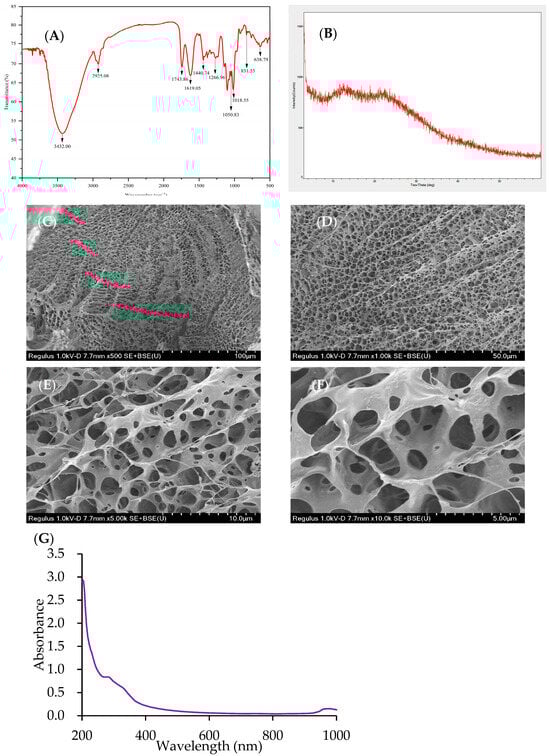 FT-IR spectrum (A), XRD diagrams (B), SEM images × 500 (C), SEM images × 1000 (D), SEM images × 5000 (E), SEM images × 10,000 (F) and UV–vis spectrum (G) of AP-SDF.