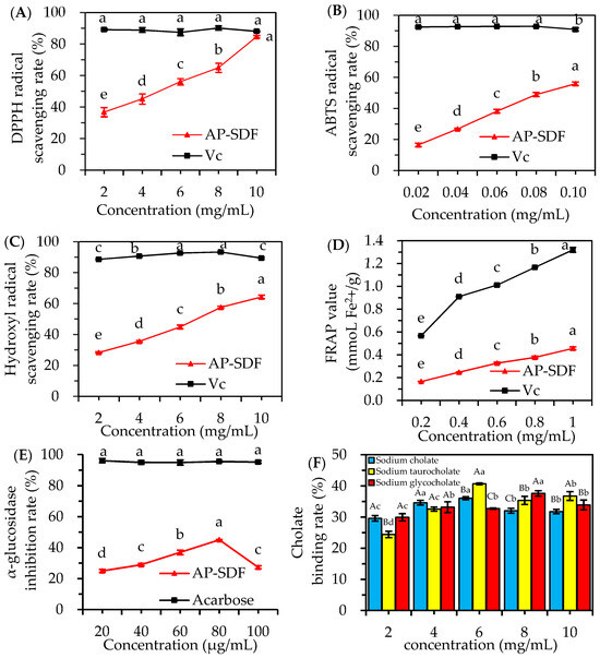 Bioactivity of AP-SDF. DPPH radical scavenging activity (A), ABTS radical scavenging activity (B), hydroxyl radical scavenging activity (C), FRAP value (D), α-glucosidase inhibitory activity (E) and cholate binding activity (F). Different lowercase letters with the same sample at different concentrations and different uppercase letters with different samples at the same concentration indicate significant differences (p < 0.05).