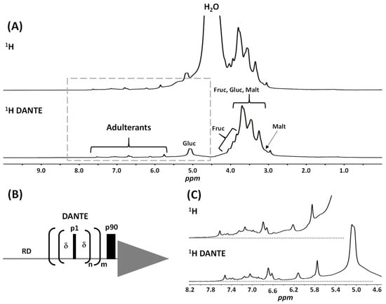 NMR optimization. (A) Comparison of a classical (relaxation delay–pulse–acquisition) and DANTE sequence for 1H NMR 60 MHz spectra recording of sample 11 after extraction in methanol-d4:CDCl3 (60:40, v/v). (B) DANTE sequence with RD: relaxation delay, δ: DANTE delay, p1: low amplitude pulse, p90: 90° pulse, m and n: number of repetitions. (C) Zoom on the framed area on the (A) spectra for better visualization of the drift in the baseline for both sequences. Spectra shown are raw spectra before applying baseline correction. Gluc: glucose, Fruc: fructose, Malt: maltose.
