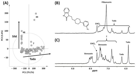 Qualitative analysis of honey samples. (A) Score plot of a PCA built from the benchtop 1H NMR data of all the samples. Benchtop 1H NMR spectra of outlier samples (9.0–5.6 ppm): (B) sample 7 and (C) sample 44. Sild: sildenafil, Tada: tadalafil.