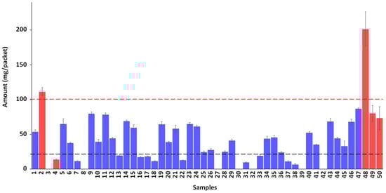 This study reveals that among the 50 samples, 76% were adulterated with tadalafil and 10% with sildenafil, while 14% were natural or non-adulterated samples. The mere presence of a hidden medicinal substance presents a clear risk to the consumer. Furthermore, as illustrated in Figure 4, most of the tadalafil-adulterated samples (28 out of 38) are above the maximum recommended therapeutic dose of 20 mg. Similarly, although the number of samples adulterated with sildenafil is lower, two out of five exceed the therapeutic dose of 100 mg. The detection of elevated levels of undisclosed active pharmaceutical ingredients in honey-based supplements poses a potential danger to consumers, especially those with chronic illnesses or sensitivities to drug interactions. Such supplements thus present significant life-threatening risks and underscores substantial public health concerns [31,32].