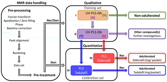 Chemometric workflow for screening of honey samples from benchtop NMR data. NMR data handling includes pre-processing and pre-treatment procedures. The qualitative block enables classification using partial least squares discriminant analysis with unit variance scaling (UV-PLS-DA) on the training set, honey samples as either adulterated (A) or non-adulterated (N), as well as detecting the presence of tadalafil (T) or sildenafil (S). The quantitative block predicts the levels of adulterant, tadalafil or sildenafil, utilizing the PLS regression model on the calibration set. Nor: normalization, Stan: standardization.