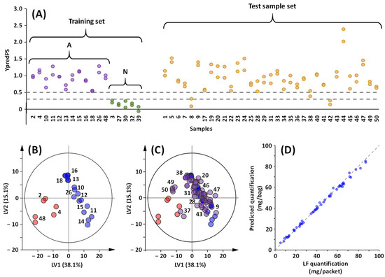 The second block is the qualitative part of the workflow. The aim is to determine whether a sample of honey is adulterated or non-adulterated, as well as whether it contains tadalafil or sildenafil. For this purpose, partial least squares discriminant analysis (PLS-DA) with unit variance (UV) scaling, i.e., UV-PLS-DA, was used. First, a predicted UV-PLS-DA model (Figure 5, I) between the two classes N and A was obtained with the training set, where samples (T) and (S) were considered together. The predicted Y-values (YpredPS) were generated and used to define class membership [35,36]. The non-adulterated samples (N) have YPredPS in the range of −0.06 to 0.27, while the YPredPS of the adulterated (A) samples is between 0.54 and 1.29 (Figure 6A). The limit value of 0.54 corresponds to sample 18, with the lowest content of adulterant (11.7 mg/packet of tadalafil) in the training dataset. Based on these values, it is possible to delineate the lowest and the highest limit of the threshold [37]. Within these limits, set at 0.30 and 0.50, test samples will be further considered as borderline. Samples from the test set classified as adulterated and borderline will be selected for the next step. The second UV-PLS-DA (Figure 5, II) was carried out between the two classes (T) and (S); the score plot of this predictive PLS-DA shows a clear discrimination between the two classes of adulterants (Figure 6B). Then, the test sample set is projected into the active PLS-DA, and the predicted score plot is used to identify the adulterant.