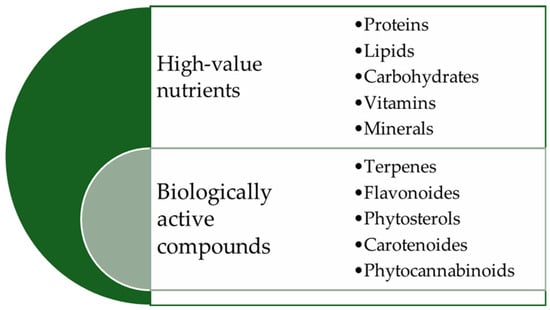 This evolution has led to a substantial increase in the consumption of vegan and vegetarian products [8], considered sustainable lifestyle options [5]. Therefore, industrial hemp (Cannabis sativa L.) becomes an attractive source of plant protein [1,9], as it does not trigger food allergies and is safe for individuals with celiac disease [10]. Hemp stands out as a renewable resource [3] with promising potential [11], attracting interest due to its versatile use [3], rapid growth [12], low capital investment [13] compared to other crops, and positive environmental impact [5]. Cultivated for thousands of years in China, Asia, and later in Europe, industrial hemp (Cannabis sativa L.) was primarily used in the textile industry. However, recent studies have highlighted the significant nutritional (Figure 1), economic, and social importance of the hemp plant (Cannabis sativa L.) [12,14,15].