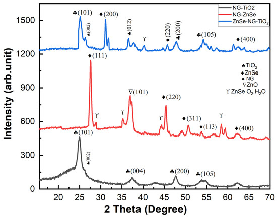 XRD analysis of NG-TiO2, NG-ZnSe, and NG-TiO2-ZnSe.
