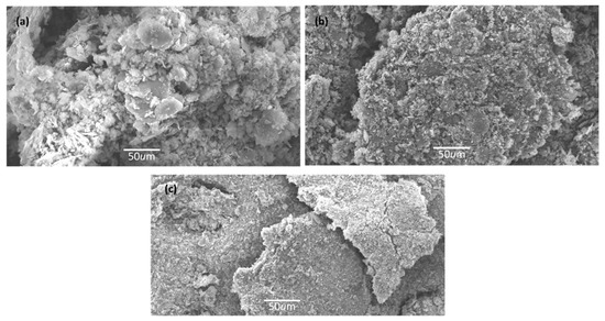 The morphological characteristics of samples were examined using scanning electron microscopy. Figure 2a–c displays the scanning electron microscope image of NG-ZnSe, NG-TiO2, and NG-TiO2-ZnSe respectively. The micrograph Figure 2a represented the agglomeration of NG-ZnSe composite. This clustering occurs as a result of interactions between graphene sheets, which create an organized structure. Such patterns are essential for supercapacitor electrodes because they provide a large surface area for ion adsorption and charge transfer processes. Similarly, the NG-TiO2 nanocomposite in Figure 2b, displayed an agglomeration of shape like cauliflower. This agglomeration is caused by the van der Waals interactions taken place in graphene sheets, which recompense the bending energy through inter-sheet adhesion, helping to maintain the composite’s stability. The attachment graphene network increases the conductivity of the electrode material, allowing for more effective charge storage and discharge in supercapacitors [29,30,31,32]. In Figure 2c, when NG is doped into TiO2-ZnSe composite, the agglomeration is decreased, and the overall surface area of the material is increased. The expanded surface area can moderate the disposition of particles to agglomerate by offering additional sites for interaction and reduced the distance among particles. This less agglomeration may also indicated the enhanced compatibility between materials that reduced interfacial tension and promoted better dispersion [33,34,35].
