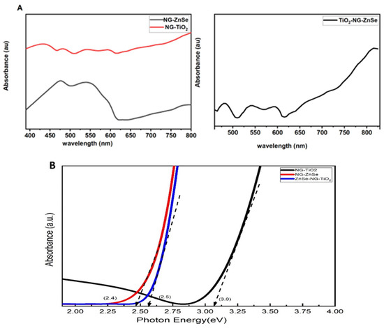 (A) Absorption spectra of NG-TiO2, NG-ZnSe, and NG-TiO2-ZnSe corresponding to sample S1, S2 and S3 respectively. (B) Band gap analysis of NG-TiO2, NG-ZnSe, and NG-TiO2-ZnSe.