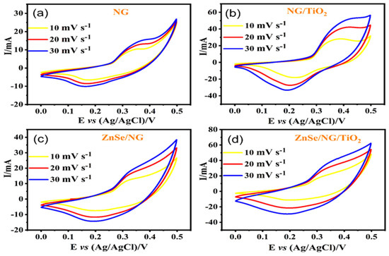 CV characterization; (a) NG, (b) binary composite of NG/TiO2, (c) binary composite of ZnSe/NG and (d) ternary composite of ZnSe/NG/TiO2.