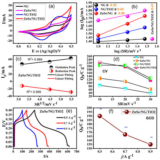 where ‘a’ and ‘b’ are adjustable variables. Usually, the power-law exponent b, is expected to range between 1 and 0.5. An exponent value close to 1 signifies capacitive behavior (surface-controlled), while around 0.5 indicate a dispersion–restricted progression (inner surface controlled). The plot of log(ip) against log(v) in Figure 6b yields a slope of 0.35, 0.43, 0.49, and 0.41 all close to 0.5, demonstrating the dispersion control charge process in the ternary composite of NG, NG/TiO2, ZnSe/NG, and ZnSe/NG/TiO2 [56].