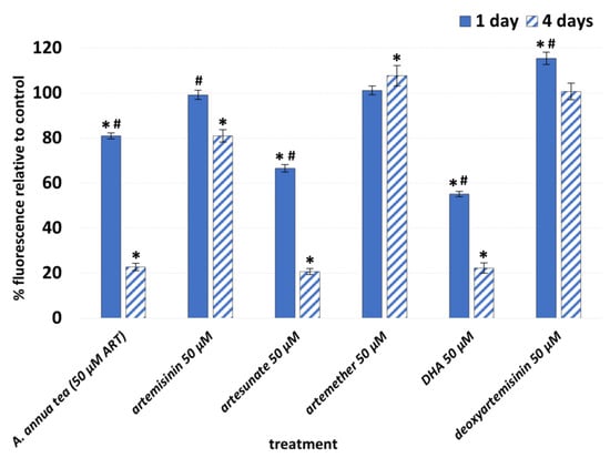 Relative viability responses of human dermal fibroblasts via resazurin assay at 1 and 4 days after exposure to artemisinin, each of the artemisinic derivatives, artemisinin’s liver metabolite deoxyartemisinin, and hot-water extracts of A. annua, all normalized to 50 µM of the relevant artemisinic compound. Control = 100%; N ≥ 12; * = p ≤ 0.05 for samples to solvent control; # = p ≤ 0.05 for 1 day compared to 4 days using Student’s t-test.