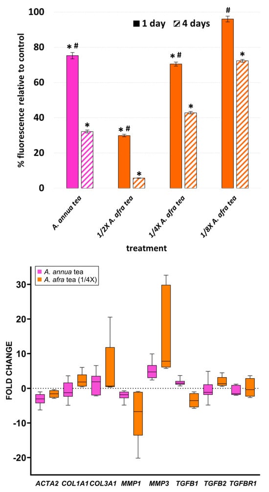 Viability and transcript expression of fibroblasts after treatment with A. annua or A. afra infusions. (Top) resazurin assay of fibroblast viability after 1 and 4 d treatment with A. annua and A. afra infusions. (Bottom) Fold change vs. solvent control of gene expression in fibroblasts after 4 d treatment with infusions of A. annua (at 50 µM ART content) and A. afra diluted to ¼ of the dry mass of the A. annua tea; GAPDH was used as the internal control; N = 12 for resazurin assay (* = p ≤ 0.05 vs. solvent control; and # = p ≤ 0.05, 1 d vs. 4 d); and N ≥ 4 for gene expression.