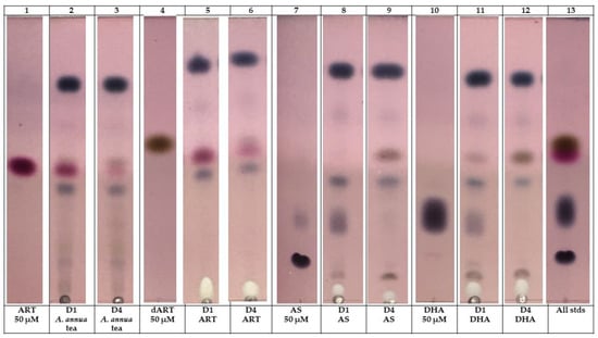 Thin-layer chromatography of media after 1 and 4 days A. annua tea and ART drug treatments of fibroblasts. Media were extracted with dichloromethane, spotted on Si-gel 60 F254 plates, and run in a mobile phase of 5:11:4 DCM:hexane:acetone plus 0.5% v/v acetic acid. Plates were stained with p-anisaldehyde reagent that stains all ART drugs dark blue–purple, except for ART (dark pink) and dART (brown). Each D1 or D4 spot represents 1 mL of extracted media, and the ART, dART, AS, and DHA standards are the equivalent of 1 mL of a 50 µM solution. Image is a composite of representative media extracts of three replicates.