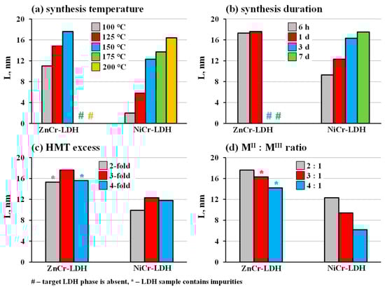 The ZnCr- and NiCr-LDHs were initially synthesized under the conditions generally adopted from the publication on MgAl-LDH [83], with the cation ratio MII:MIII = 2:1, implying heating of the aqueous solutions of the metal nitrates with a 3-fold HMT excess at a rate of 150 °C∙h−1, up to 150 °C, followed by isothermal maintenance for 1 d and cooling down for approximately 1 h (the default conditions). The resulting samples were identified by means of an XRD analysis (Figure 1, red patterns). It was shown that both LDHs are single-phase compounds not containing any crystalline impurities and that their patterns are similar to those of their counterparts synthesized by the coprecipitation method (PDF cards N° 00-052-0010 and N° 00-052-1626). The XRD patterns were successfully indexed in a hexagonal system and the lattice parameters were found to be a = 3.11 Å, c = 22.7 Å and a = 3.07 Å, c = 22.7 Å for the ZnCr- and NiCr-LDHs, respectively. The greater a lattice parameter of ZnCr-LDH is apparently associated with a larger Zn2+ crystallographic radius compared to that of Ni2+. At the same time, the c parameters of both samples are equal, indicating that their interlayer spaces have approximately the same width. With all that said, the HMT-assisted method of hydrothermal synthesis proved to be fully applicable to the LDHs under consideration.