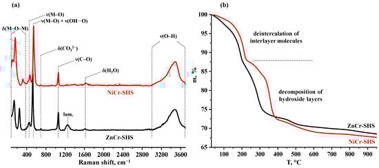 Raman spectra (a) and TG curves (b) of ZnCr- and NiCr-LDHs.