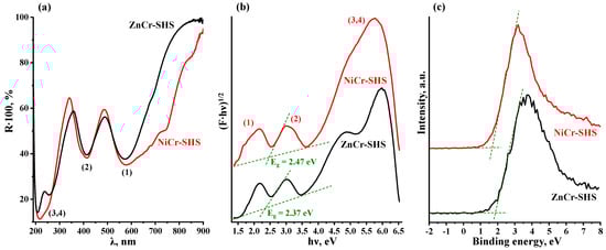 The regions of intrinsic light absorption and the optical bandgap energies Eg of the LDHs were examined by means of DRS with a Kubelka–Munk transformation (Figure 4a,b). As noted in the introduction, the available literature provides the reader with contradictory Eg values for the samples in question, which range from 2 to 4 eV. Apparently, these discrepancies originate from the complex structure of the ZnCr- and NiCr-LDHs’ spectra in comparison with those of traditional TiO2-based photocatalysts and, as a consequence, lead to ambiguous attribution of the absorption peaks to the interband transition. Indeed, both LDHs exhibit at least two distinctive absorption bands, marked as (1) and (2) in the visible spectrum area, as well as two overlapping ones, designated as (3,4), in the ultraviolet region (Figure 4a,b).