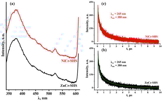 To estimate the intensity of radiative electron–hole recombination, the most crystalline samples (ZnCr-SHS with L = 18.0 nm and NiCr-SHS with L = 25.7 nm) were investigated by means of TR-PLS (Figure 5). The same measurements were also performed for two reference photocatalysts of hydrogen production, tested earlier under the same conditions (titanium dioxide TiO2 P25 Degussa and layered perovskite-like oxides H2Ln2Ti3O10, Ln = La, Nd) [98] (Figure S2). All the samples were excited at λ = 265 nm and their photoluminescence decay was detected at the maximum of each emission spectrum. The average photoluminescence lifetimes of both LDHs (Table 3) were determined to be slightly less than those for TiO2 P25 Degussa (2.0 μs) and 2.5–3 times less than for H2Ln2Ti3O10 (4.8 μs for Ln = La, 5.4 μs for Ln = Nd). This comparison indicates that the unmodified LDHs in question are characterized by a greater electron–hole recombination rate than the aforementioned layered oxides adopting a perovskite structure.